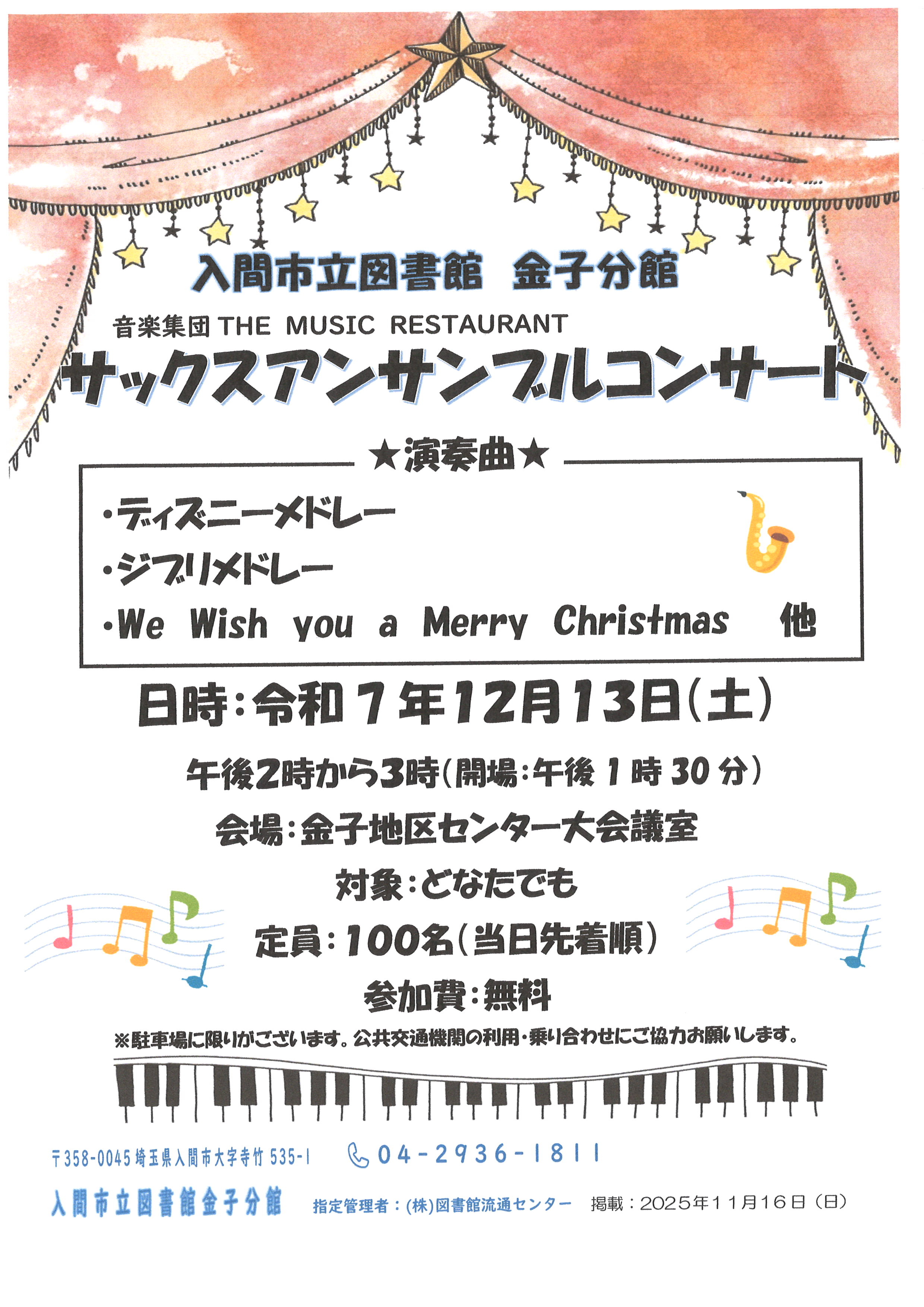 | 詳細内容 | 音楽集団THE MUSIC RESTAURANTによるサックスアンサンブルコンサートを行います。ディズニーやジブリのメドレー曲、クリスマスの名曲で楽しいひと時を過ごしませんか? 演奏曲:ディズニーメドレー ジブリメドレー We Wish you a Merry Christmas 他 お申込みは不要です。当日先着順となります。 駐車場に限りがございます。公共交通機関の利用・乗り合わせにご協力お願いします。 |