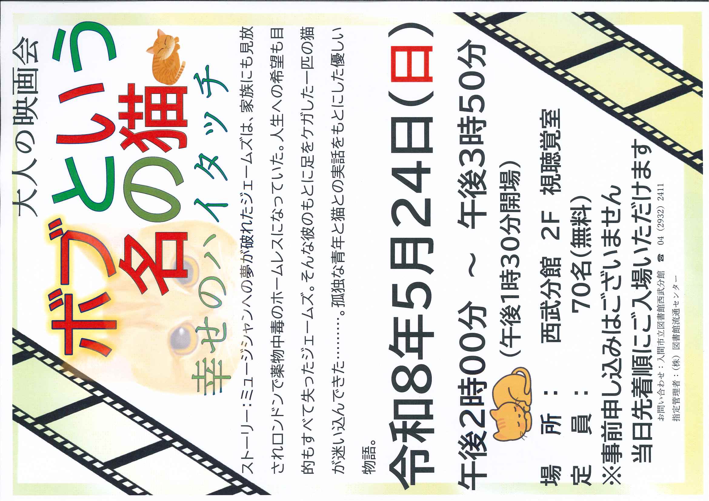 | 詳細内容 | 上映作品『ボブという名の猫』(2017年上演作品) 監督:ロジャー・スポティスウッド 原作:ジェームズ・ボーエン 出演:ルーク・トレッダウェイ ジョアンヌ・フロガット 上映時間:1時間43分 上映年:2017年 あらすじ ミュージシャンへの夢が破れたジェームズは、家族にも見放されロンドンで薬物中毒のホームレスになっていた。人生への希望も目的もすべて失ったジェームズ。そんな彼のもとに足をケガした一匹の猫が迷い込んできた…。孤独な青年と猫との実話をもとにした優しい物語。 事前申し込みはございません。当日先着順にご入場いただけます。 ご参加お待ちしております。 |