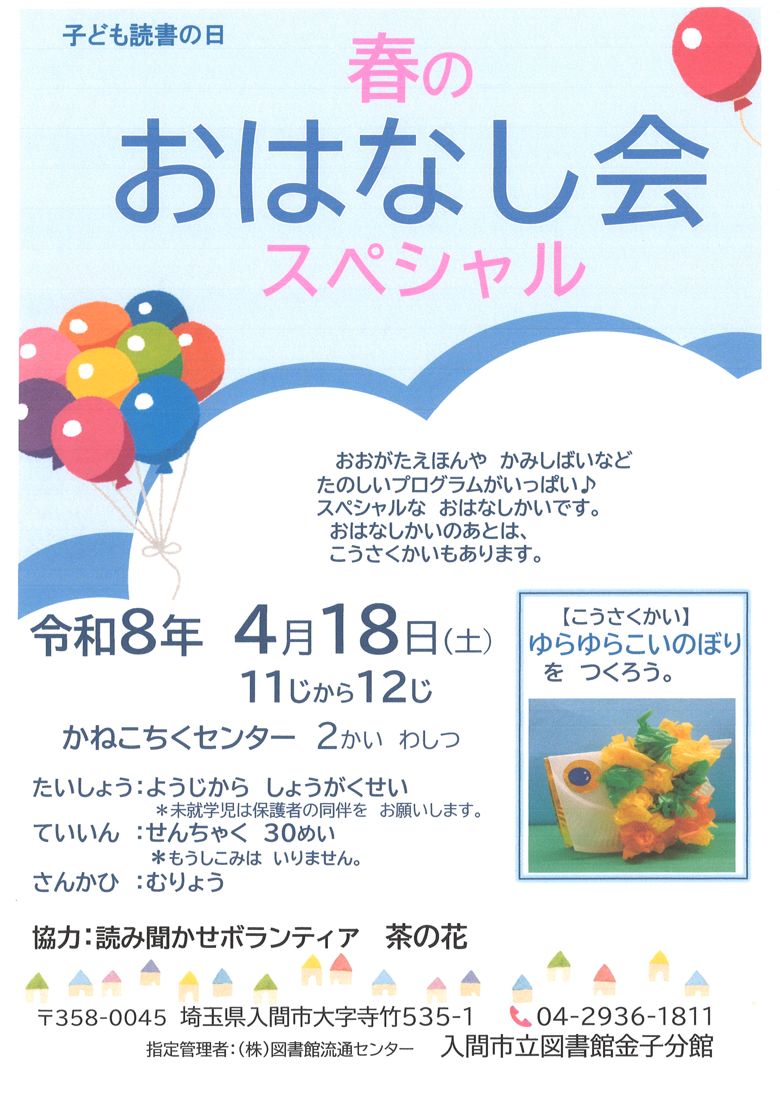 | 詳細内容 | 「子ども読書の日」、「こどもの読書週間」にちなんで、 おはなし会のスペシャルバージョンを行います。 前半30分は、大型絵本や紙芝居などの楽しいプログラムがいっぱいのスペシャルなおはなし会です。 後半30分は、工作会をします。 (工作の材料や道具はすべて図書館で用意します。) 協力:読み聞かせボランティアグループ「茶の花」 事前のお申し込みは不要です。直接会場までお越しください。 |