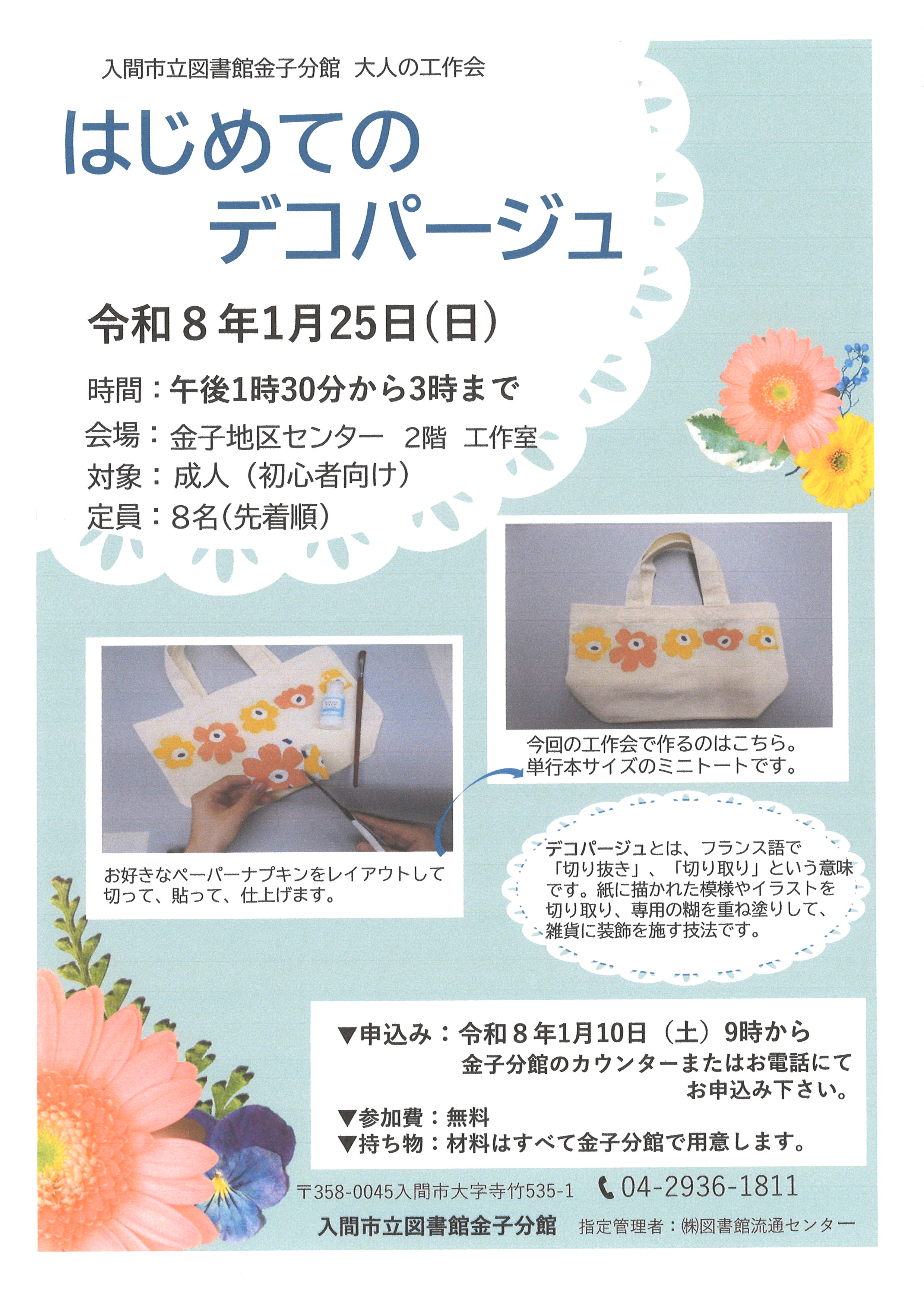 | 詳細内容 | 人気の手芸「デコパージュ」にチャレンジしてみませんか。 お好きなペーパーナプキンを使って、単行本が入るミニトートバッグを作ります。 デコパージュとは、フランス語で「切り取り」、「切り抜き」という意味です。紙に描かれた模様やイラストを切り取り、専用の糊を重ね塗りして、雑貨に装飾を施す技法です。 材料はすべてこちらでご用意いたします。 ぜひお気軽にご参加ください。 お申込みは、2026年1月10日土曜日午前9時から金子分館のカウンターまたはお電話にて受付いたします。 |