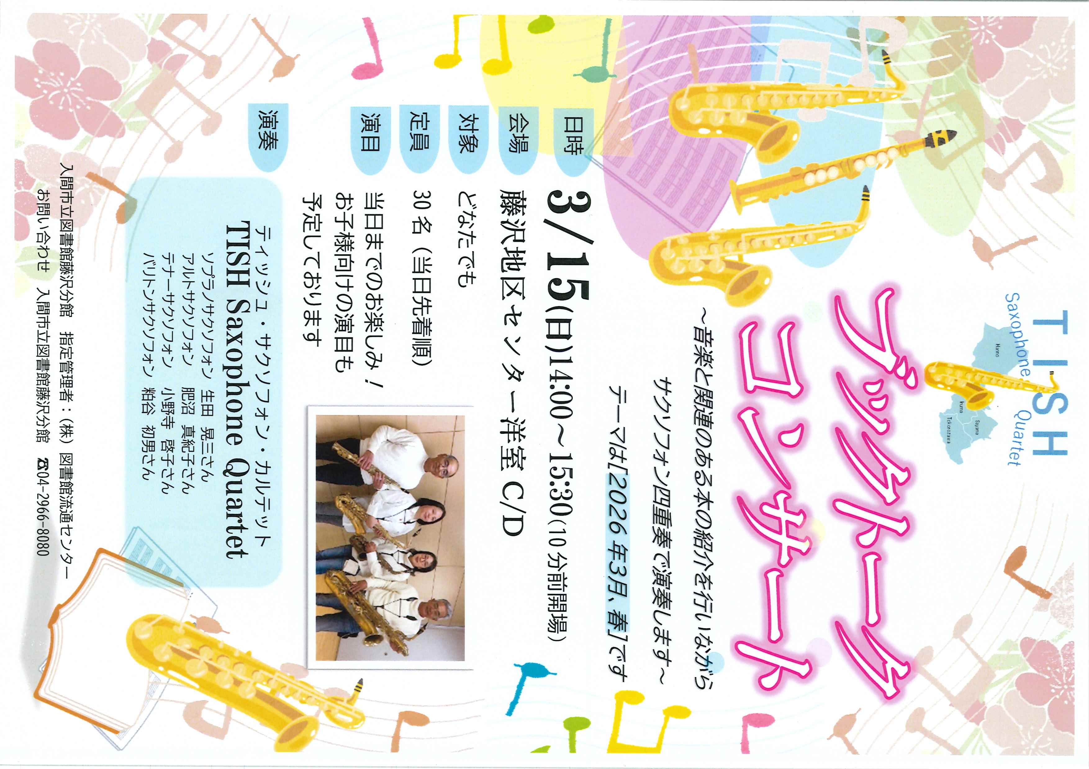 | 詳細内容 | 音楽と関連のある本の紹介をしながら、サクソフォン四重奏団TISH Saxophone Quartetによるコンサートを行います。 テーマは【2026年3月、春】です。 演目は当日までのお楽しみです!お子様向けの演目も予定しております。 |