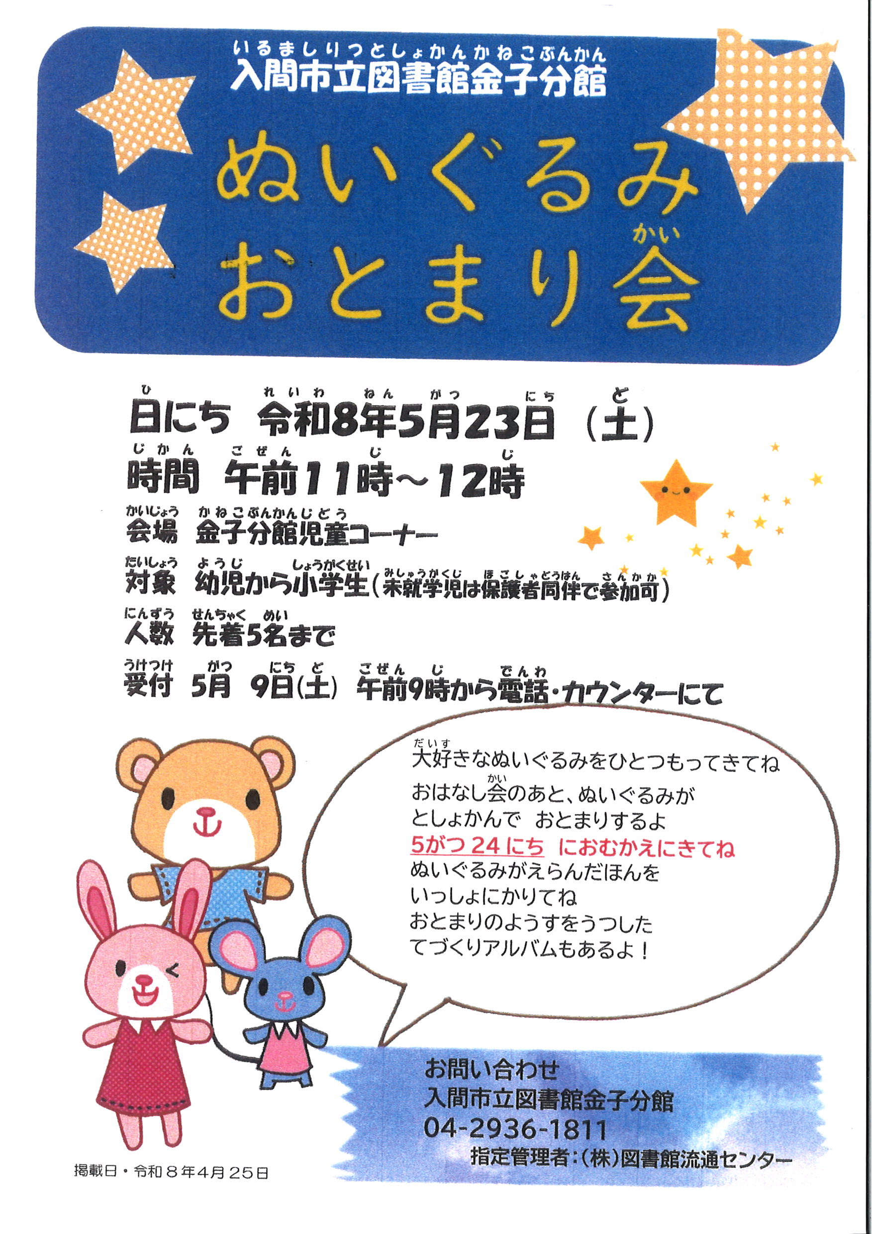 | 詳細内容 | 大好きなぬいぐるみを図書館におとまりさせてみませんか? 5月23日(土曜日)午前11時から正午まで ぬいぐるみと一緒におはなし会に参加しましょう。 おはなし会が終わったあと、ぬいぐるみたちは図書館におとまりします。 5月24日(日曜日)午前9時から午後5時まで ぬいぐるみのお迎えに金子分館までお越しください。 お迎えの際に、ぬいぐるみがおとまりしている様子を撮影した アルバムをプレゼントしますのでお楽しみに! おとまりしている間に、ぬいぐるみたちがオススメの絵本を みつけてくれるかもしれません。 ぜひ借りておうちで一緒に読んでみてください。 受付開始日:令和8年5月9日(土曜日)午前9時から。 お電話または金子分館のカウンターにてお申し込みください。 定員に達し次第、受付は終了となります。予めご了承ください。 ご応募をお待ちしております。 |